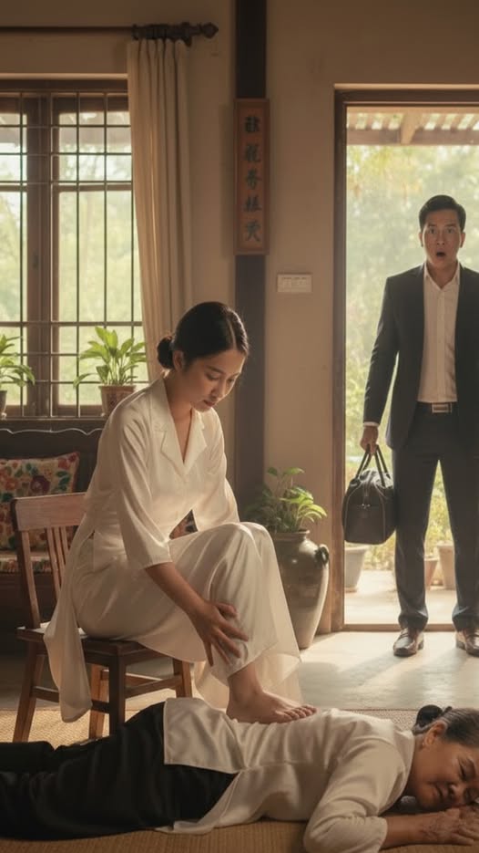 Trên sàn nhà mát lạnh, mẹ tôi nằm sấp, hai tay đặt dưới gối như cố chịu đựng cơn đau nào đó. Và My – người vợ mà tôi vẫn luôn nghĩ là không quen động tay vào việc nặng – đang ngồi trên sofa, mặc bộ đồ lụa mềm, tay lướt điện thoại, còn một chân… đang giẫm lên lưng mẹ.